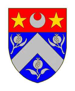 D’azur au chevron d’argent, accompagné de trois grenades tigées et feuillées du même, au chef cousu de gueules chargé d’un croissant d’argent entre deux étoiles d’or.