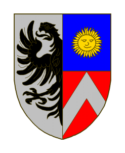 Parti, au I d’argent à une demi-aigle éployée de sable, mouvant du parti, au II coupé d’azur au soleil rayonnant d’or, et de gueules au chevron d’argent.