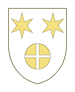 Un besant ou tourteau chargé d’un filet en croix, accompagné en chef de deux étoiles à six rais.