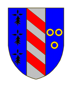 Tiercé en pal, au I d’azur à trois mouchetures d’hermines de sable rangées en pal, au II de gueules à trois bandes d’argent, au III d’azur à trois annelets d’or.