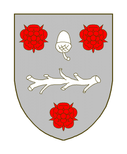 D’argent à la branche écotée en fasce, accompagnée de trois roses de gueukes, et au point du chef d’un gland renversé.