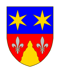 Coupé, en chef d’azur à deux étoiles à six rais d’or, en pointe de gueules à deux fleurs de lis d’argent accostant une montagne d’or issante de la pointe.