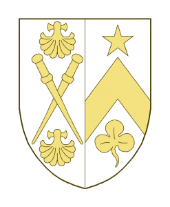 Parti au I deuxbourdons de pèlerin en sautoir, accompagnés de deux coquilles, une en chef, une en pointe, au II un chevron abaissé surmonté d’une étoile, accompagné en pointe d’un trèfle.