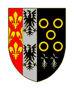 Parti au I parti de gueules à deux fleurs de lis d’or en pal et deux demies fleurs de lis du même mouvant des flancs, et d’argent à deux aigles de sable, l’une sur l’autre, au II de sable à cinq annelets d’or posés en sautoir et accompagnés en chef de deux mouchetures d’hermines d’argent.