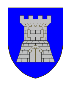D’azur à la tour crénelée d’argent, maçonnée de sable.
