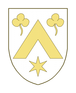 Un chevron alésé, accompagné en chef de deux trèfles, en pointe d’une étoile à six rais.