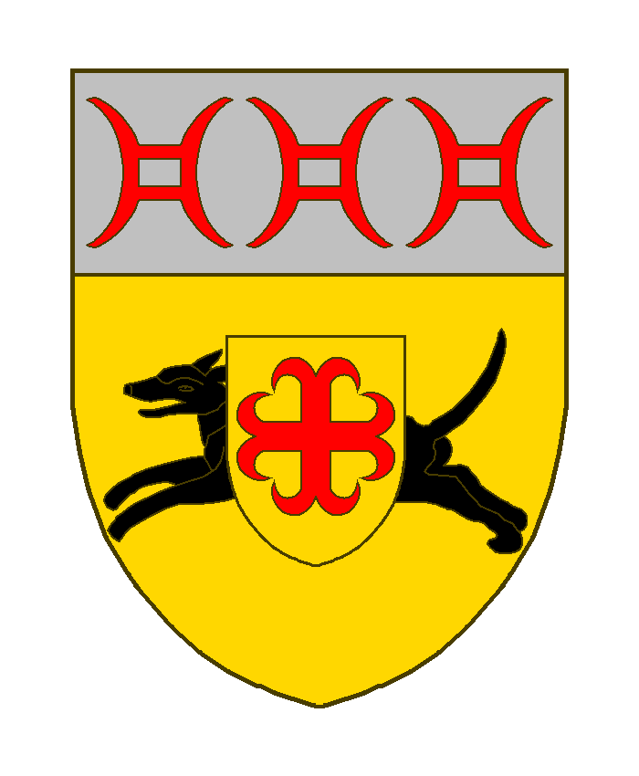 D’or au lévrier courant de sable, au chef d’argent chargé de trois fers de moulin de gueules, et sur le tout un écusson d’or à la croix ancrée de gueules.