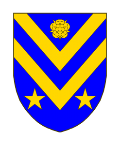 D’azur au chevron d’or renversé et vidé (alias deux chevronsrenversés) accompagné en chef d’une rose d’or, en pointe de deux étoiles du même.