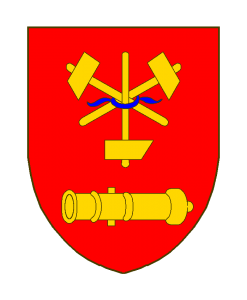 De gueules à deux martinets (marteaux) emmanchés d’or, la tête vers le chef, mis en sautoir, et un de même mis en pal, la tête vers la pointe, liés d’azur, et un canon d’or mis en fasce à la pointe de l’écu.