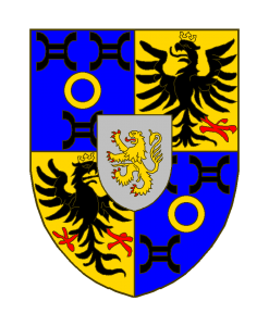 Écartelé: aux I et IV d’azur à l’anneau d’or posé en coeur, accompagné de trois anilles de sable, deux en chef, une en pointe, aux II et III d’or à l’aigle de sable, couronnée d’or, membré e de gueules, celle du III contournée. Sur le tout d’argent au lion d’or (armé et lampassé de gueules?).