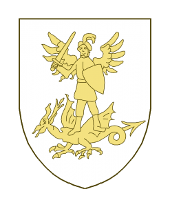 L’archange St. Michel casqué, tenant de la dextre une épée, de la sénestre un bouclier, terrassant un dragon.