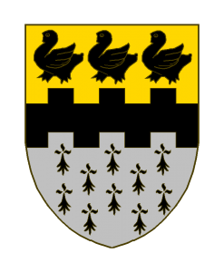 Coupé, d’or à trois merlettes de sable rangées en fasce, et d’hermines plain, à la fasce bretessée et contre-bretessée de sable brochant sur le coupé.