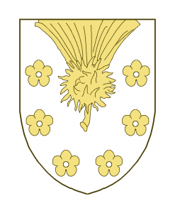 Une fleur de chardon, le haut écimé mouvant du chef, accompagnée de six quintefeuilles entourant la fleur aux flancs et en pointe.