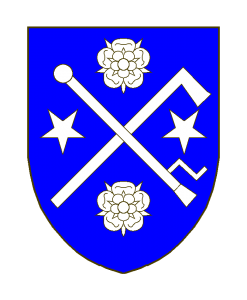 D’azur à deux outils (voir dessin) en sautoir, accompagnés de deux roses, une en chef, une en pointe, et de deux étoiles renversées aux flancs.