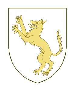 Une tête et col de loup entre deux cornes de boeuf garnies chacune, en haut, d’une embouchure.