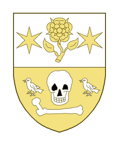 Coupé, en chef une rose feuillée et tigée accostée de deux étoiles à six rais en pointe un crâne accosté de deux oiseaux, et accompagné en pointe d’un fémur posé en fasce.