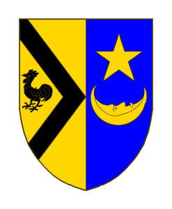 Parti au I d’or au chevron de sable mouvant du flanc dextre, accompagné à dextre d’un coq de sable, au II d’azur au croissant figuré d’or, surmonté d’une étoile du même.